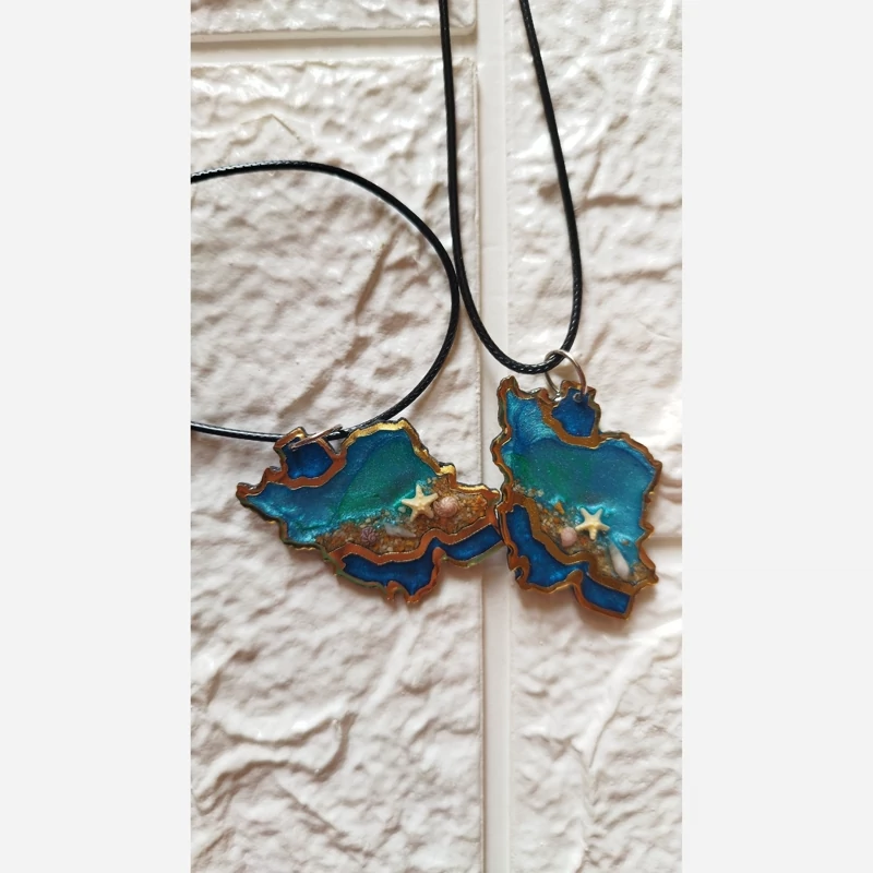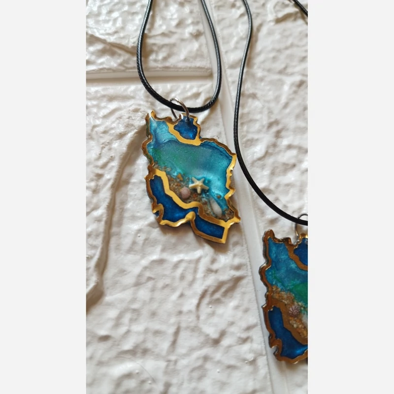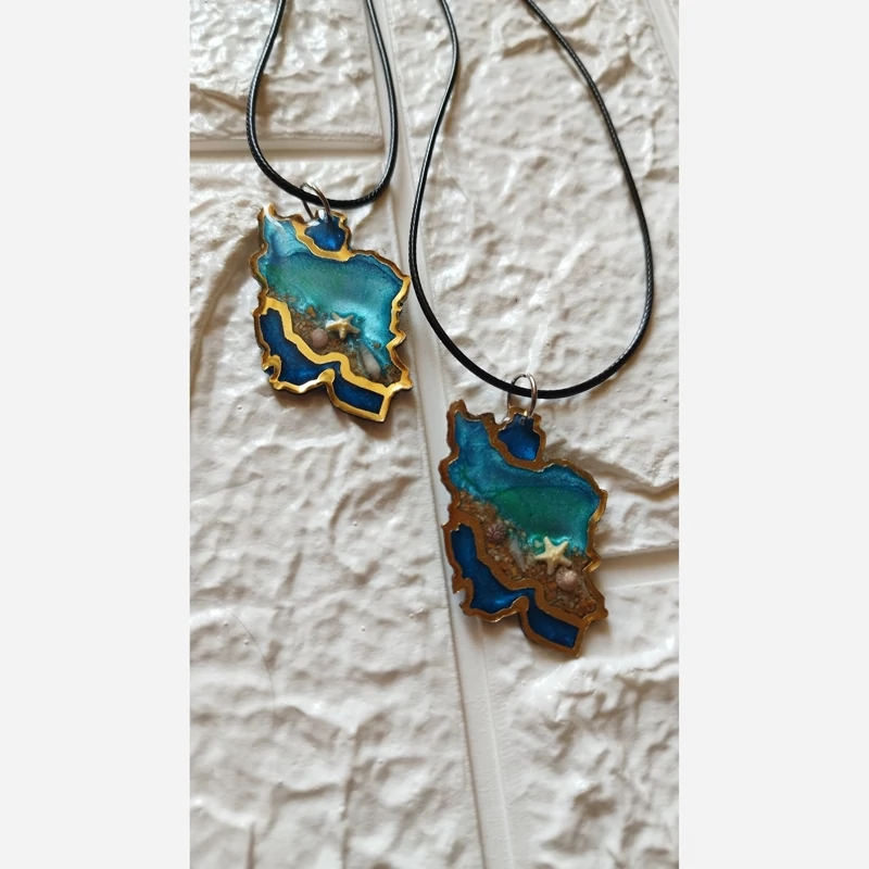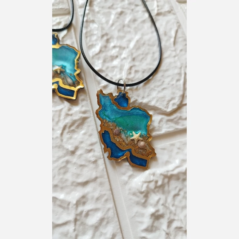 گردنبند رزینی نقشه ایران مدل دریا بند چرم اجرا شده روی مولتی استایل رنگ ثابت و ضد حساسیت مناسب برای هدیه دادن مناسب همه استایل ها قابل شستشو و محکم شن و صدف مینیاتوری و طبیعی