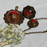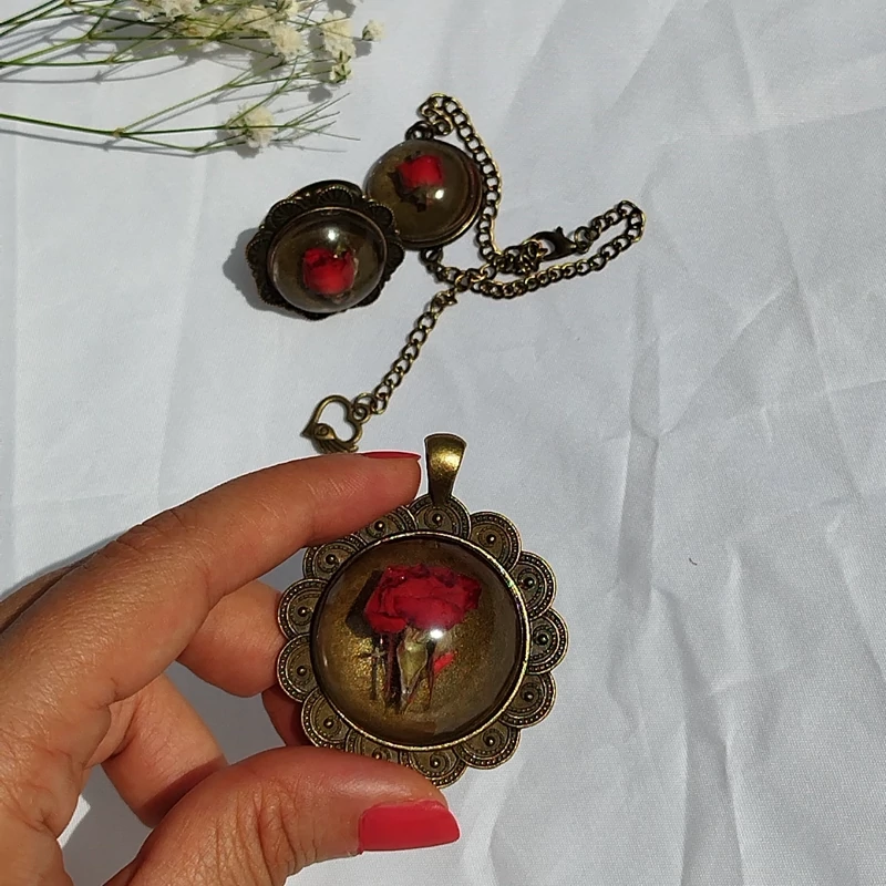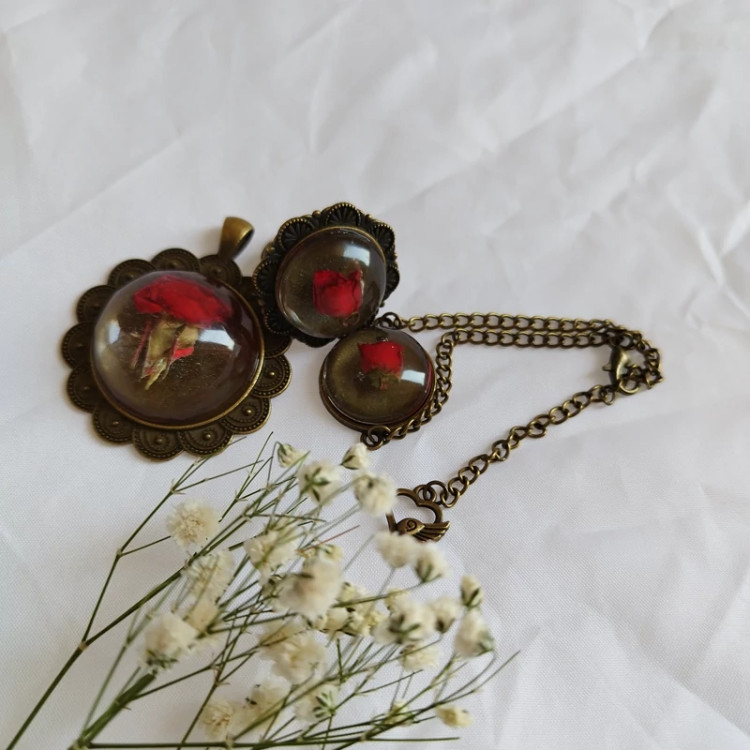 گردنبند انگشتر و دستبند رزینی ساخته شده با گل سرخ طبعی