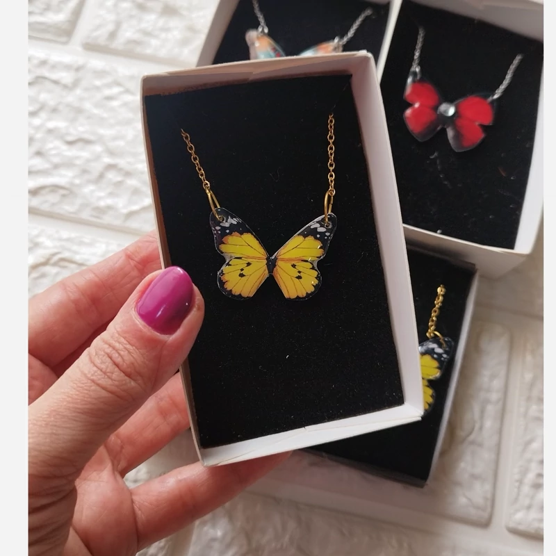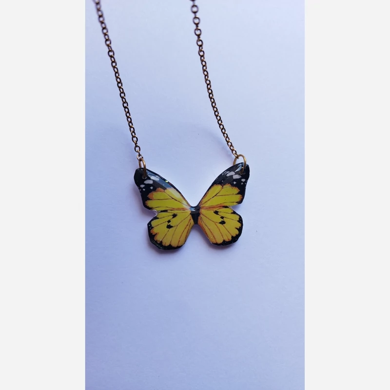 گردنبند رزینی پروانه زرد رنگ زنجیر استیل درجه یک و رنگ ثابت قابل شستشو مناسب هدیه دادن